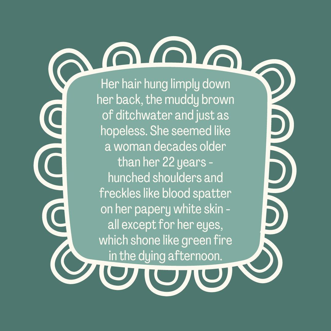 Here we have a rather romantic and dreamy picture painted of this young woman. She’s relaxed in her world, graceful, daydreaming. This could easily belong in a romance or a coming-of-age contemporary novel. We have language that evokes the natural world—glinting sunlight, flecks of gold, mossy green, legs like a colt—and it’s rich in colour and sensory description in a comforting kind of way. Compare this to: